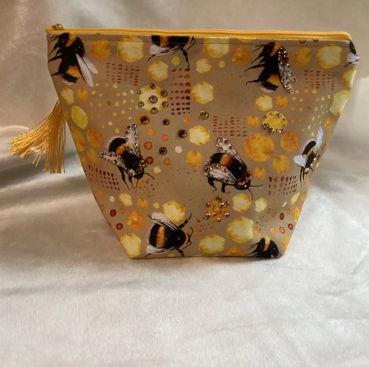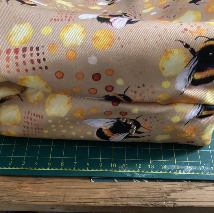 Ive made this unique bag from beautiful Bee cotton fabric and yellow cotton for lining. For embellishments I’ve used different colours Crystal Rhinestones Gems in jumbo, large and medium size.