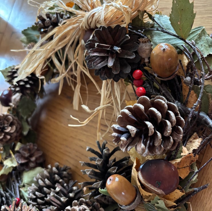 An autumn wreath made from silver birch base, decorated with acorns, fircones, conkers and poppy seed heads, clay berries are added for colour, all finished off with a raffia bow. This wreath will last for months and can be adapted for Christmas by just adding a few pretty baubles.