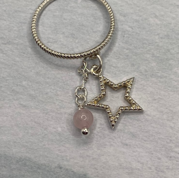 This ring is a UK size N (US size 6.75 / EU size 54). Star charm measures 10mm x 9mm, rose quartz dangle measures 14mm approx.