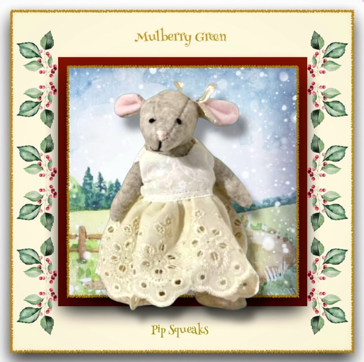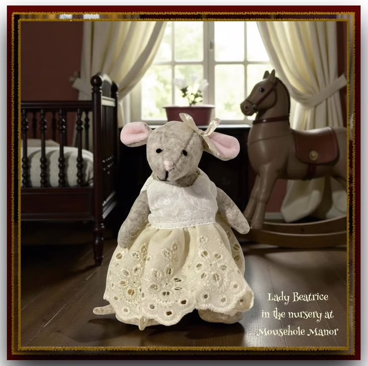 Lady Beatrice Tarragon, in her pretty cream lace dress and matching bow, is one of the aristocratic Tarragon family of Little Nippers, who live in Mousehole Manor, at the far end of the Burrows underneath the barn at Mulberry Farm. Beatrice is a young Little Nipper - a Pip Squeak. Pip Squeaks are 11cm tall.