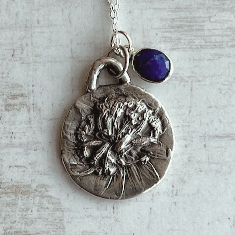 This pendant has a flat organic round shape with the flower details in relief. It has been given a patina to bring out the details in the flower. Then burnished and polished to a soft shine to create a very tactile piece. I have added a lapis lazuli charm, traditionally a birthstone for December.