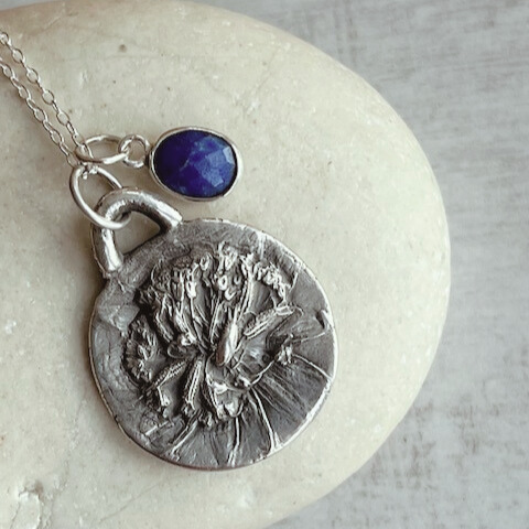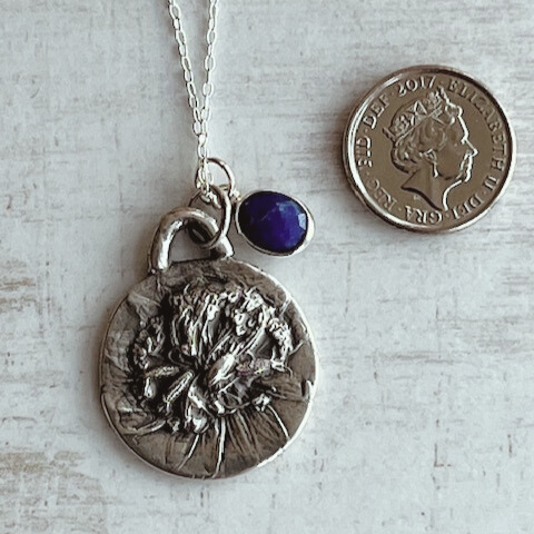 Botanical silver pendant with an impression of an astrantia flower with a lapis lazuili charm.