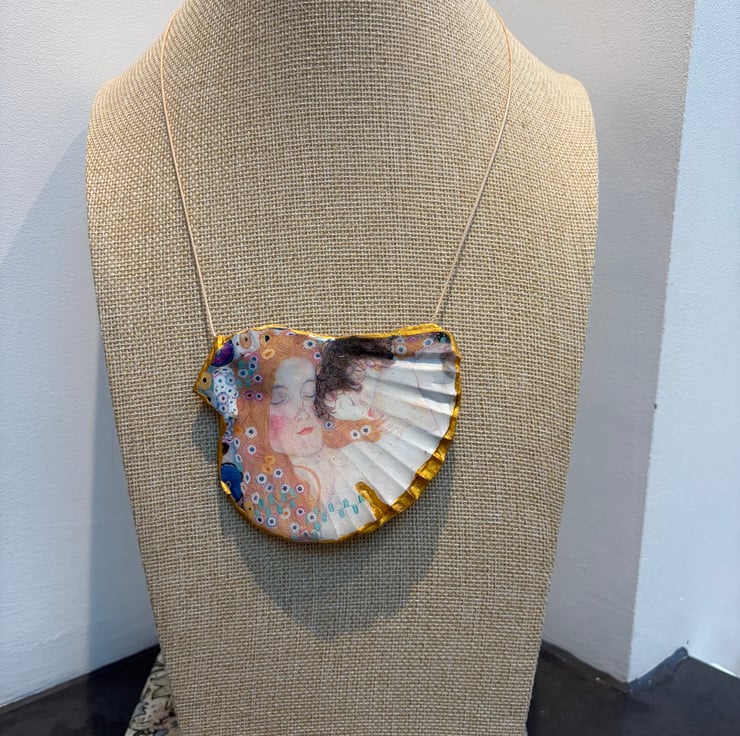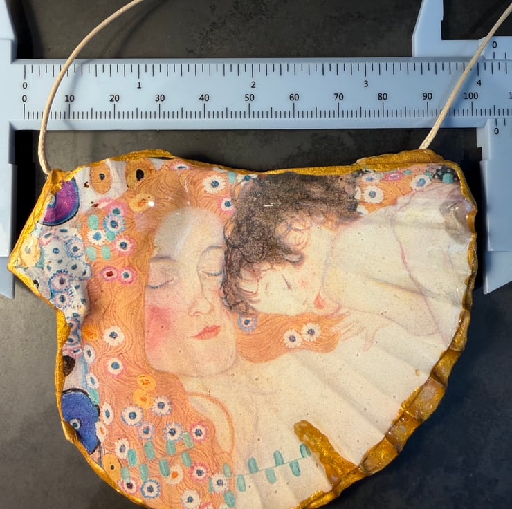 A scallop shell decoupaged with modge podge with Klimt mother and child image then finished with resin and hung with waxed cord and pop clasp