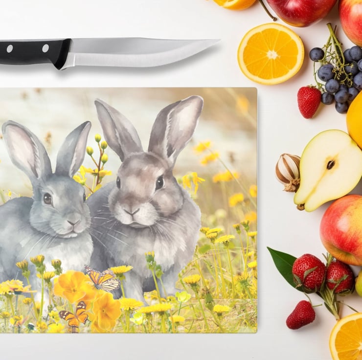 Bring a little meadow magic into your kitchen with this charming glass chopping board featuring two irresistibly cute bunnies surrounded by fluttering butterflies and cheerful yellow flowers. The artwork bursts with gentle springtime energy — soft fur, delicate wings, and golden blooms all captured in vibrant detail.