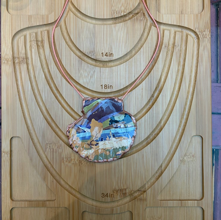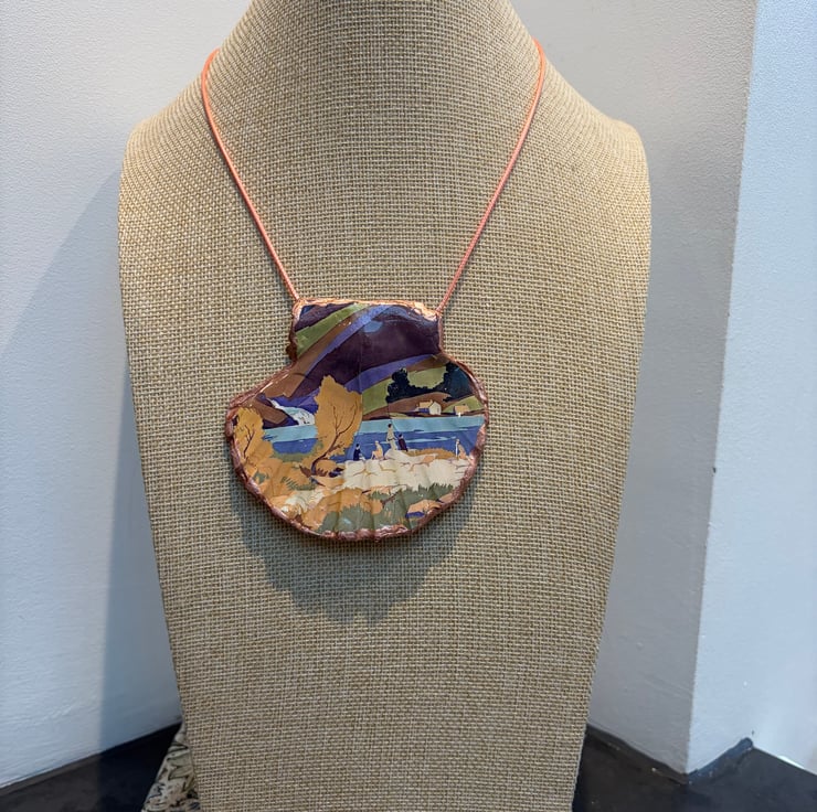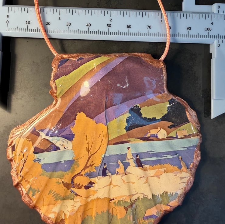 Vintage railway poster of the Lake District decoupaged onto a whole scallop shell with modge podge finished with resin, hung with waxed cord and a pop clasp