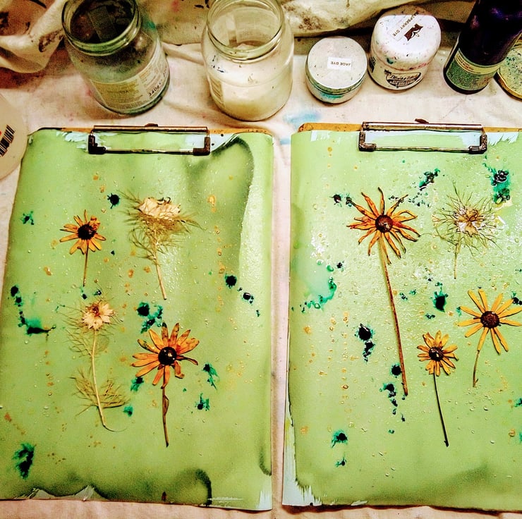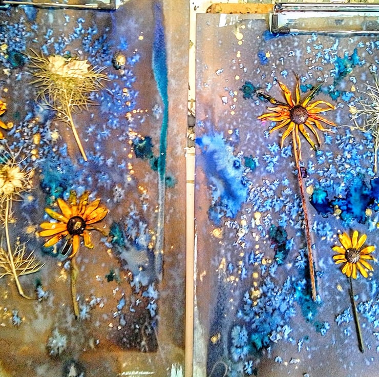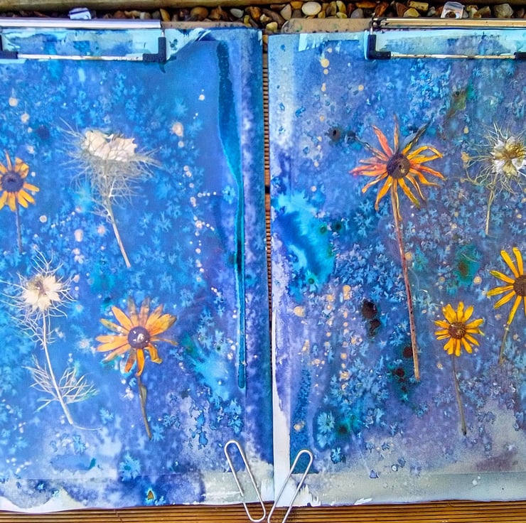I used some Jardin Turquoise ink, as well as some Winsor and Newton Gold ink to add a dash of sparkle! I also used salt in the wet cyanotype developing process, because this gives a wonderful crystalising effect.
