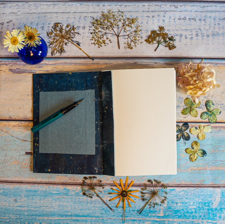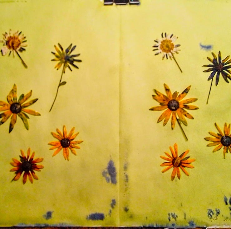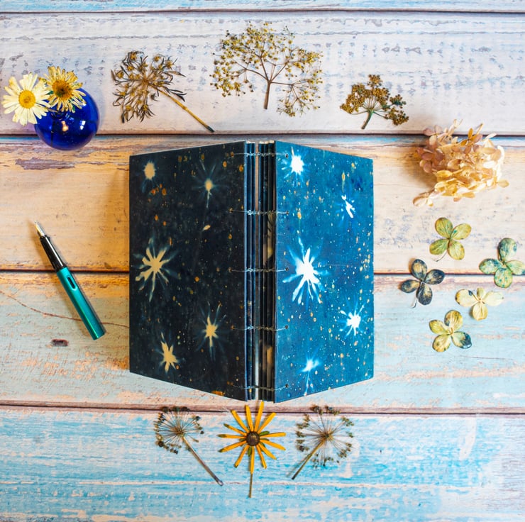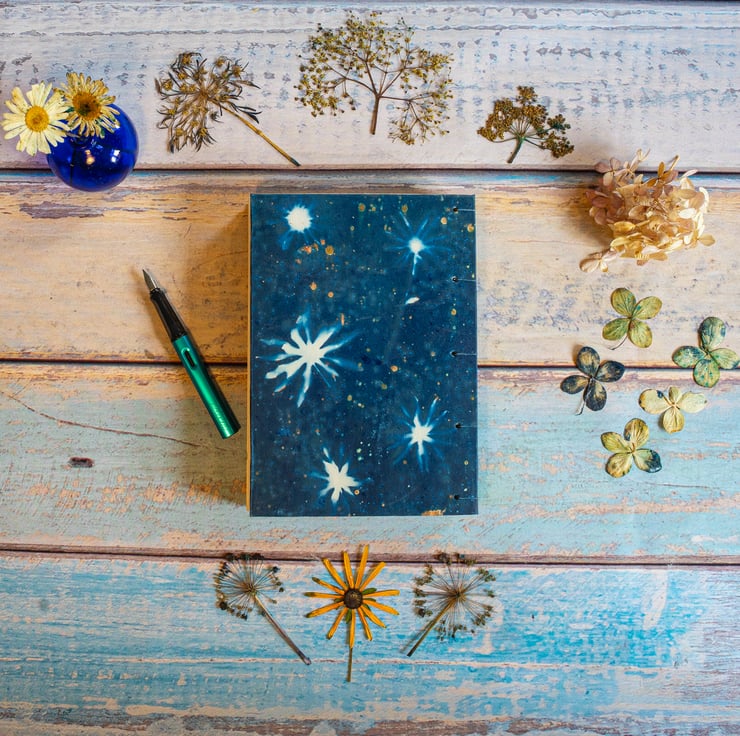 The covers for this pretty hand bound journal were made using original cyanotype prints, and feature Black-eyed Susan daisies from my English country garden, and wild Ox-eye daisies. Daisies make such lovely subjects for cyanotypes.