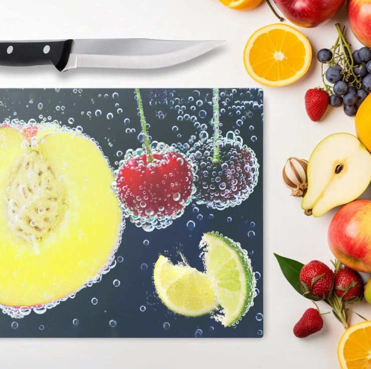 Add a burst of luxurious colour to your kitchen with this striking glass chopping board featuring a sumptuous peach and vibrant fruits suspended in shimmering bubbles against a deep black background. The contrast between the glowing, juicy tones and the dramatic dark backdrop creates a bold, modern artwork that instantly elevates any countertop.