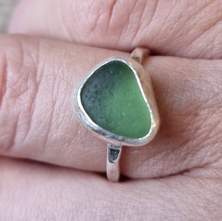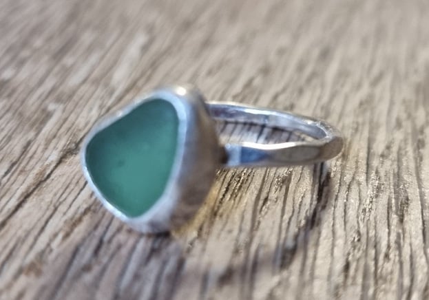 The seaglass is set in a handmade bezel which holds the glass securely. The band of the ring is faceted.