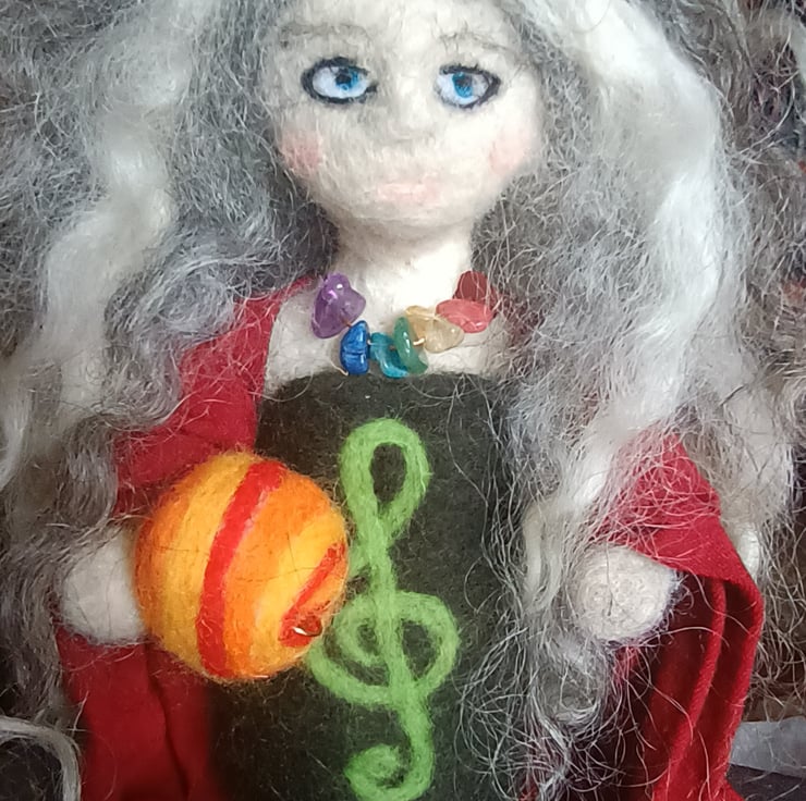 She is holding the sun - the fire of life and vitality. She bears a child. She has greying but magnificent hair and conveys a calm knowledge and inner peace that only advanced age can provide. She wears a musical symbol - the treble clef - on her gown and on her back is the star constellation of The Big Dipper. She comes with a dark red cloak made from a soft fabric.