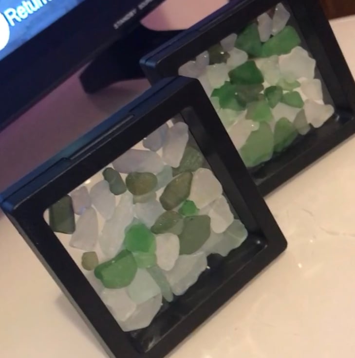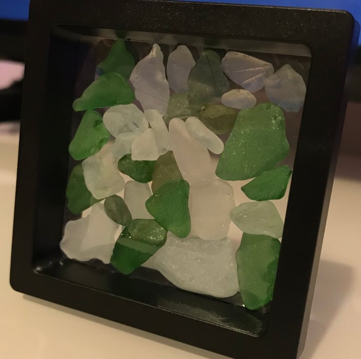 3D Floating Sea Glass Display Pictures. Each piece features genuine sea glass arranged to look as if it’s suspended in air, highlighting its natural colors and textures.