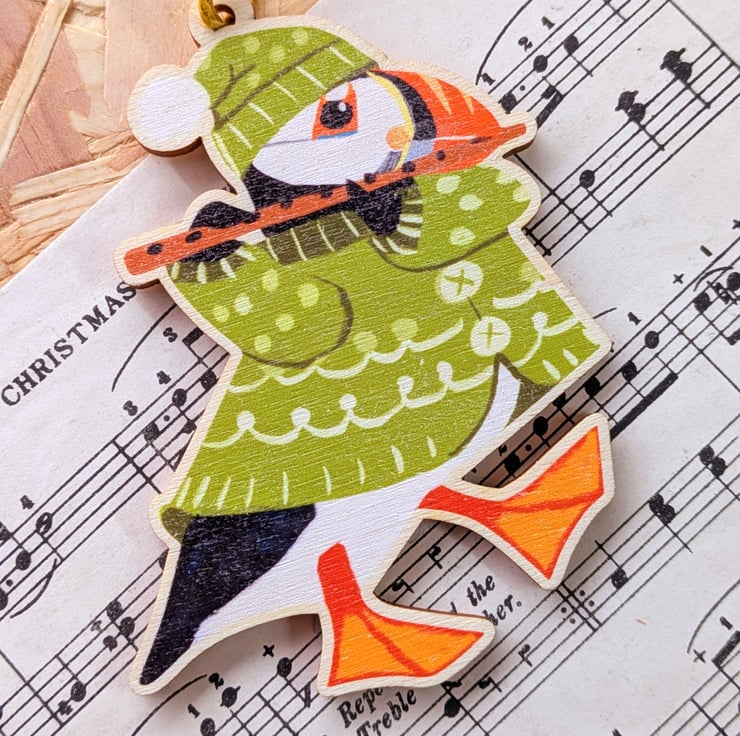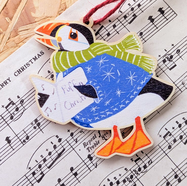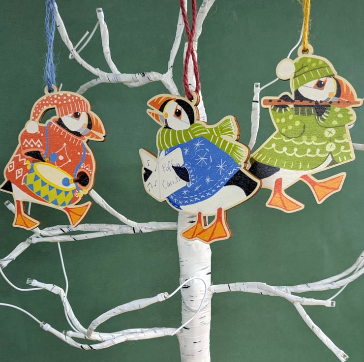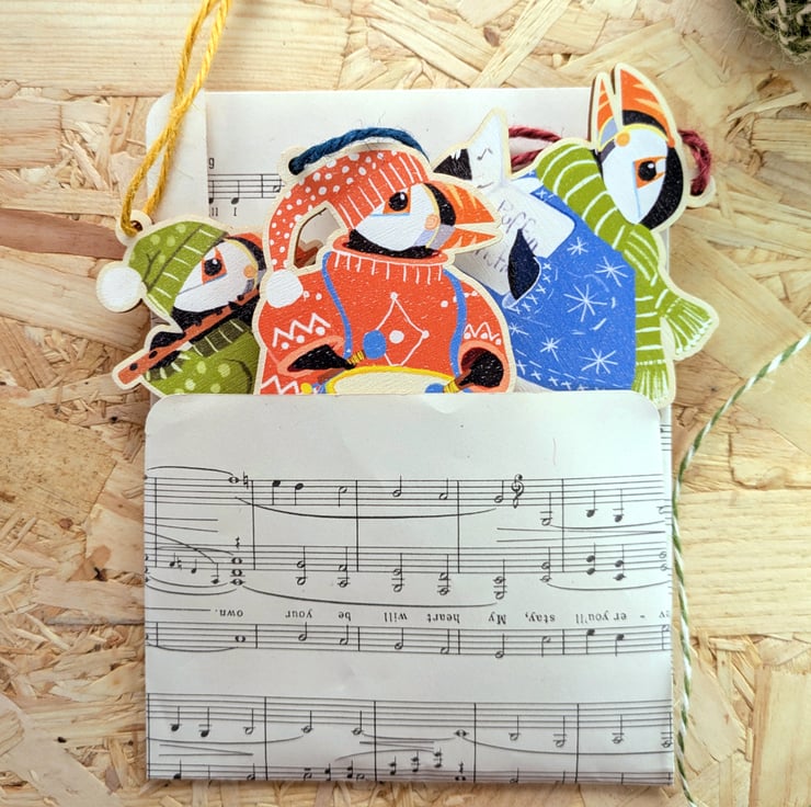 Unique illustrations by me The Hedgerow Artists printed in the UK on to sustainable wood. These fabulous little decorations can be bought individually or as a set. If you buy the set they will come gift wrapped in a handmade envelope created using old music sheets.