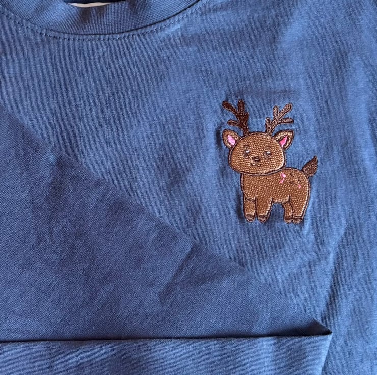 A Christmas reindeer embroidered on the left chest of a T-shirt. A cute little festive reindeer t-shirt for the Christmas season. A perfect way to join in with Christmas jumpers but in a subtle way. Available in black, blue or white long sleeve Tshirts. If you’d like any changes please get in touch and I’ll do my best to make it.