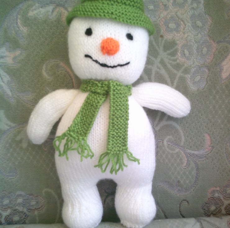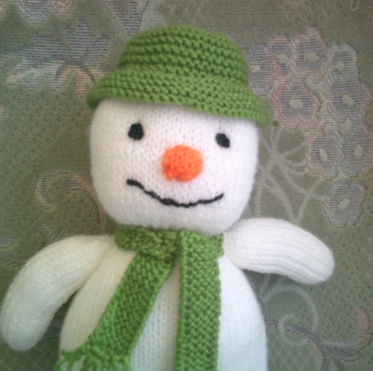 This hand knitted Snowman is made using White acrylic yarn and he is sporting a lovely green hat and scarf to keep him warm. He has an orange nose and back "buttons" along with a happy smile.