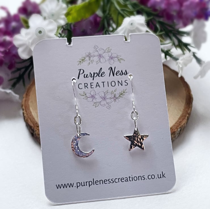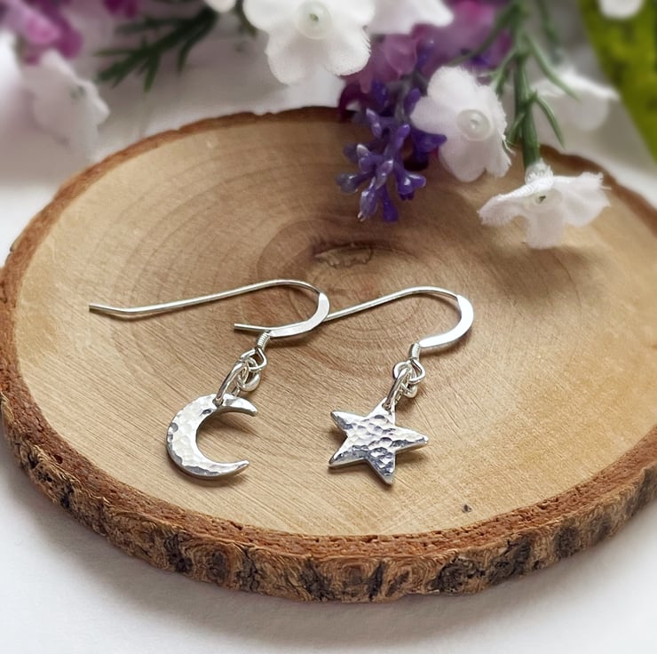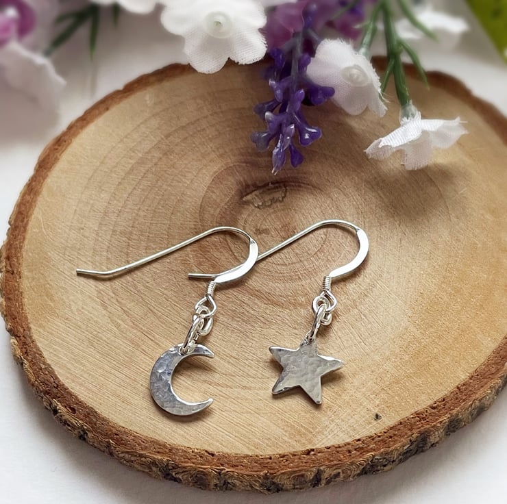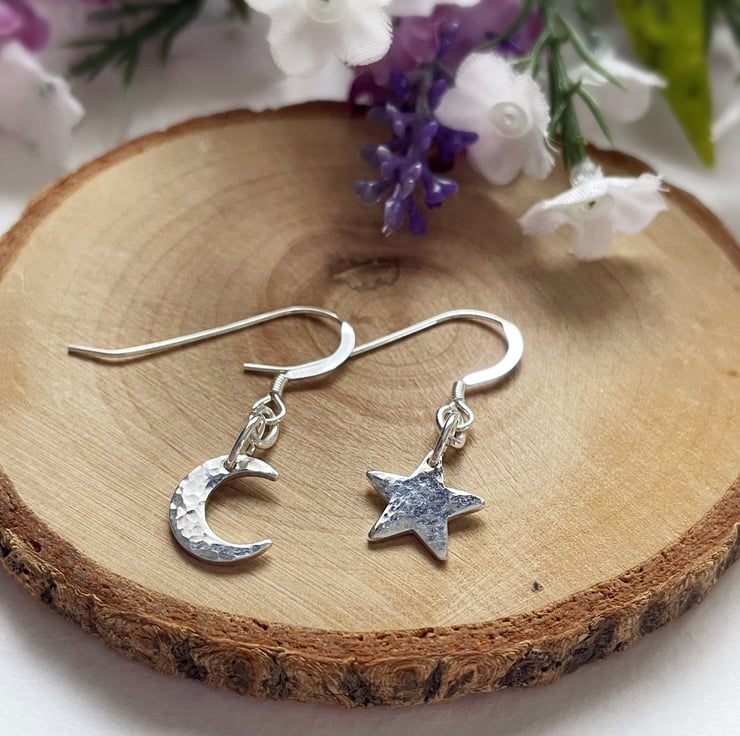 Take the night sky with you wherever you go, with these sterling silver, hammered, moon and star earrings.