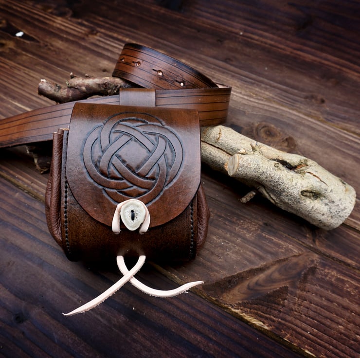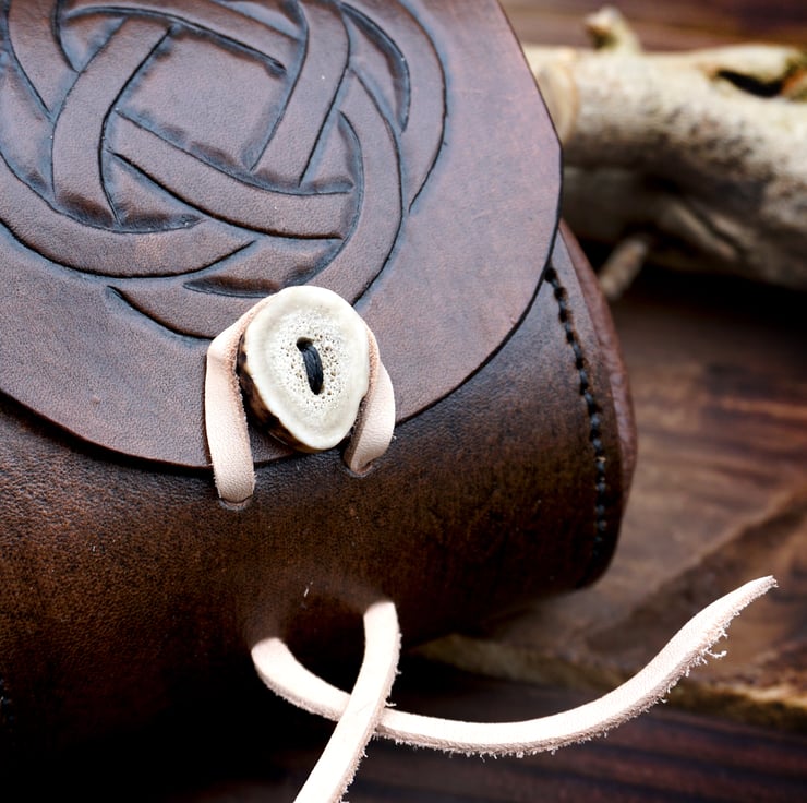 Handcrafted Medieval-style leather belt pouch with Viking knot embossing. Made from full-grain vegetable-tanned and Italian chrome-tanned leather, hand-stitched for authenticity. Deer Antler Button. Durable, practical, and perfect for reenactments, cosplay, or everyday wear.