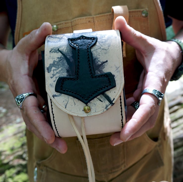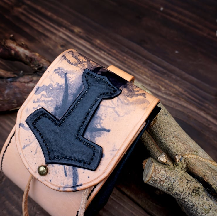 Carry the power of Thor with this handmade leather belt pouch, featuring a hand-carved Mjolnir design inspired by Norse mythology. Each pouch is crafted with precision, blending authentic Viking style with practical functionality. Made from full-grain vegetable-tanned and pig-split leather, fully hand-stitched for authenticity. Perfect for Medieval cosplay, Viking reenactment, or everyday use.