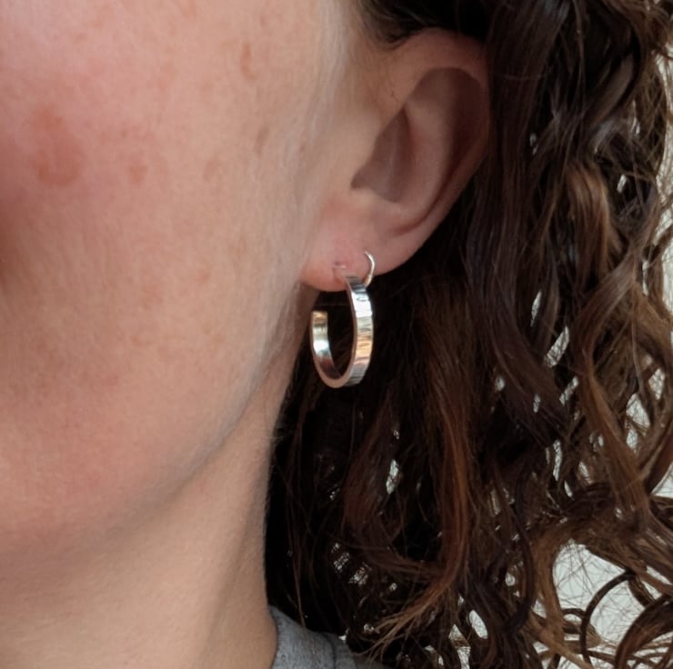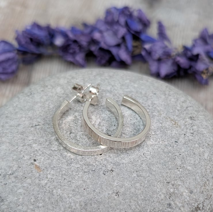 These Silver Bark Textured Hoop Earrings are handmade from recycled sterling silver, with a bark inspired hammered pattern that adds subtle texture and depth. The half-hoop design combines the classic style of hoops with the comfort of stud earrings, making them perfect for everyday wear.