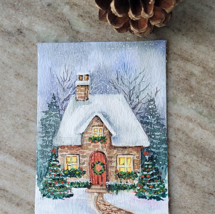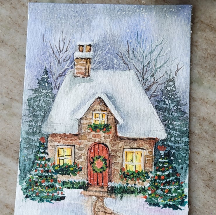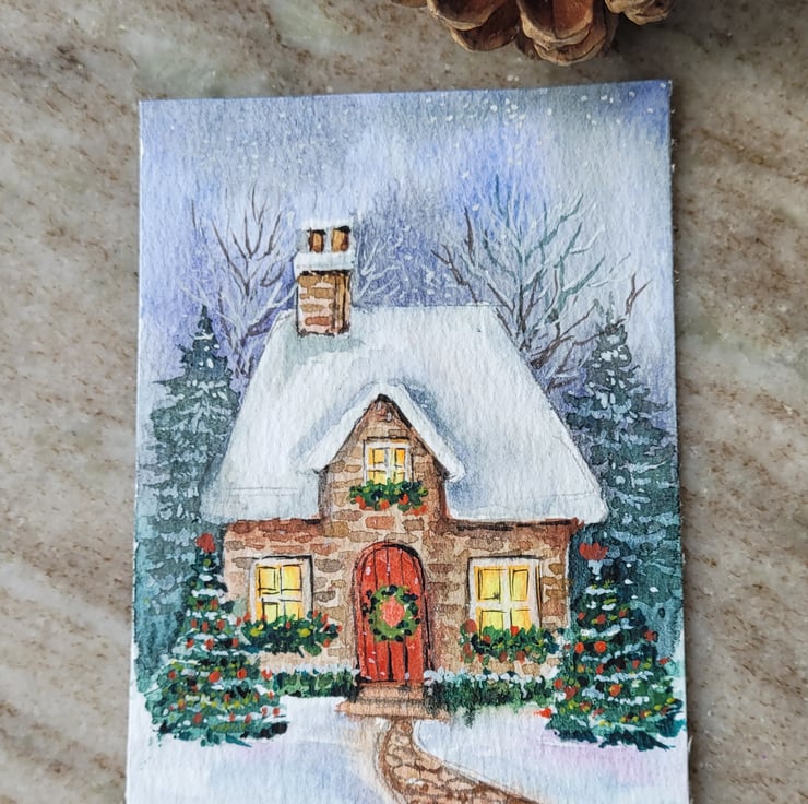 original watercolour ACEO, mini artwork, Winter, cosy christmas cottage