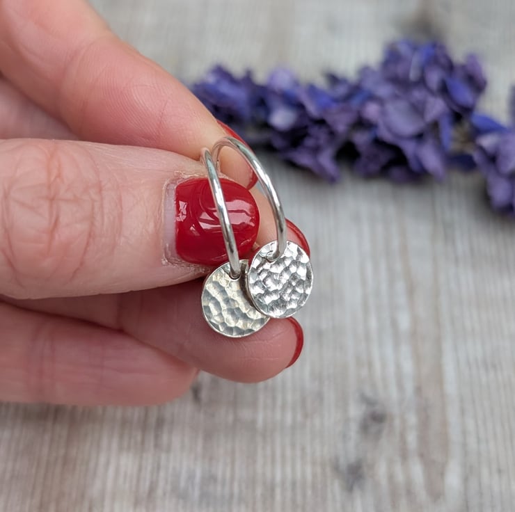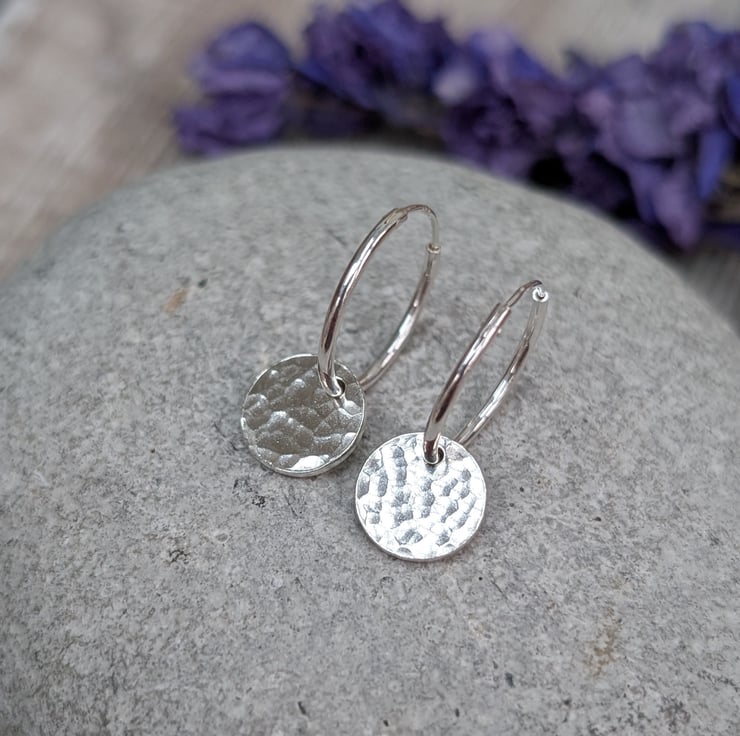 These Silver Hammered Disc Hoop Earrings are handmade from recycled sterling silver and feature small hammered discs that gently catch the light as they move. The simple hoop design makes them lightweight and comfortable to wear every day.
