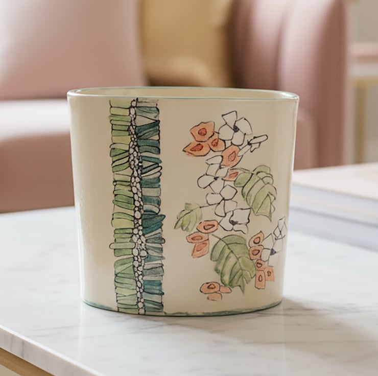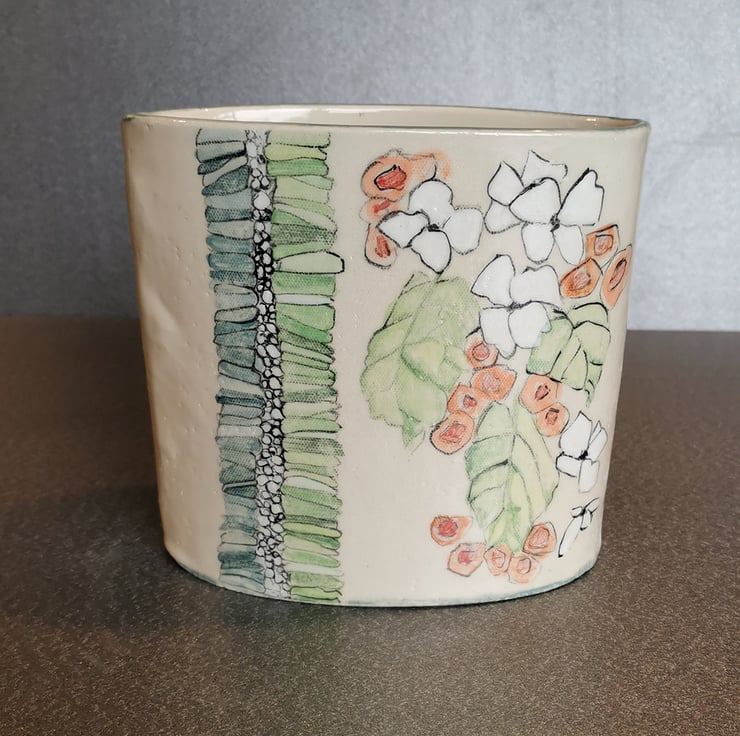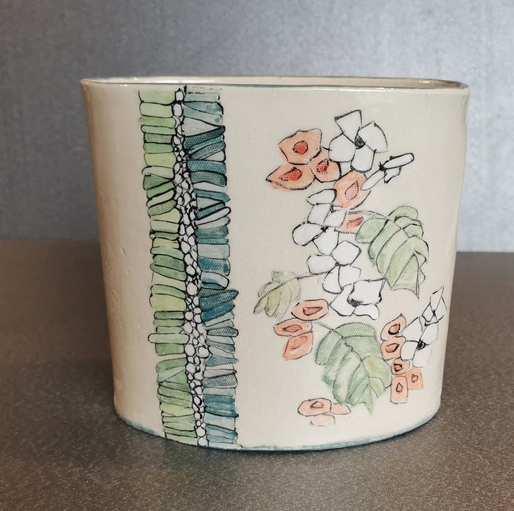 Handmade stoneware glazed vase or utensil holder with hand-painted design by Kathleen Hepworth
