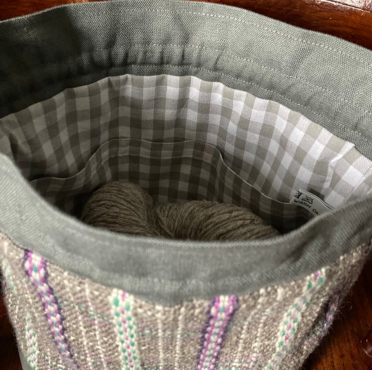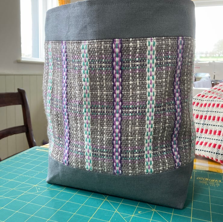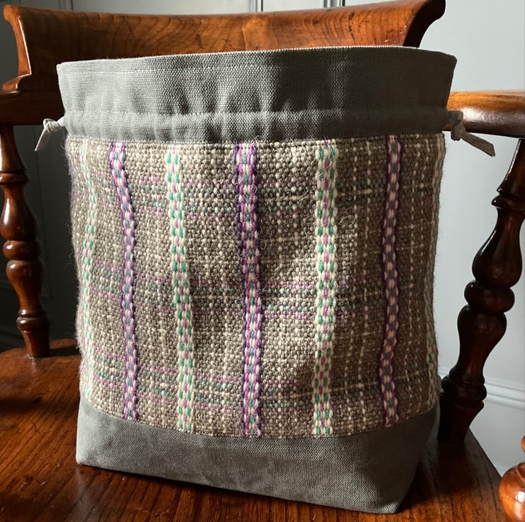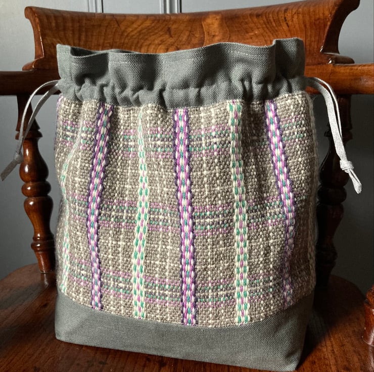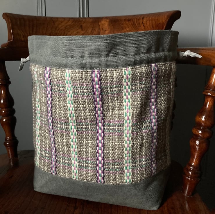 Ou woven cloth is complemented with a Laura Ashley linen fabric in dark steel grey and fully lined with a pale grey gingham linen/cotton fabric, which has 3 useful pockets.