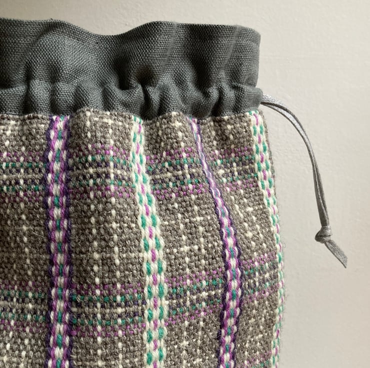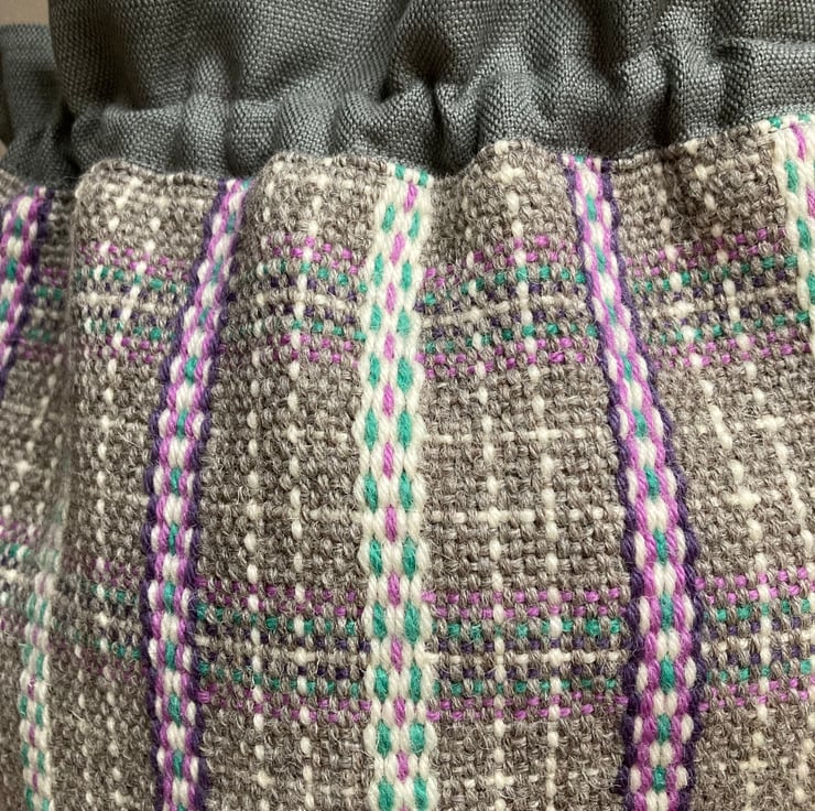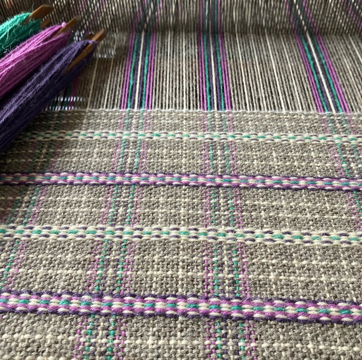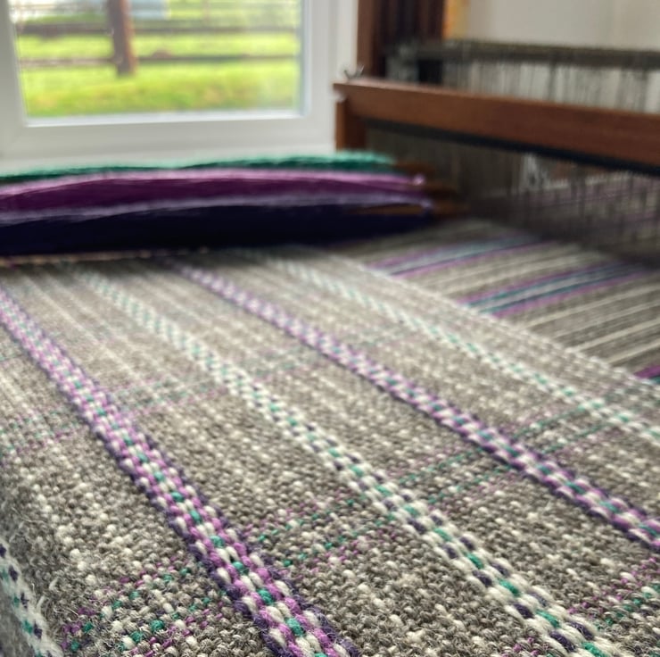 Handwoven wool fabric in shades of thistle lilac, purple, green along with the natural shades of grey and ecru wool which we use as a base mix for most of our woven cloth - all British wool.