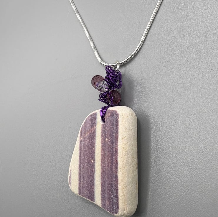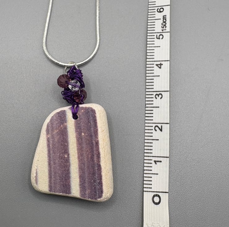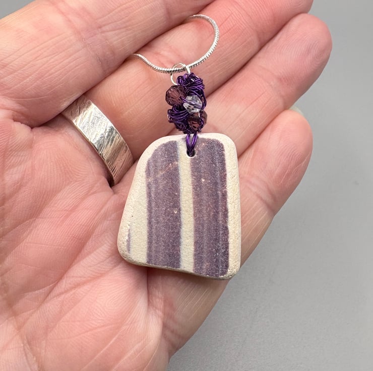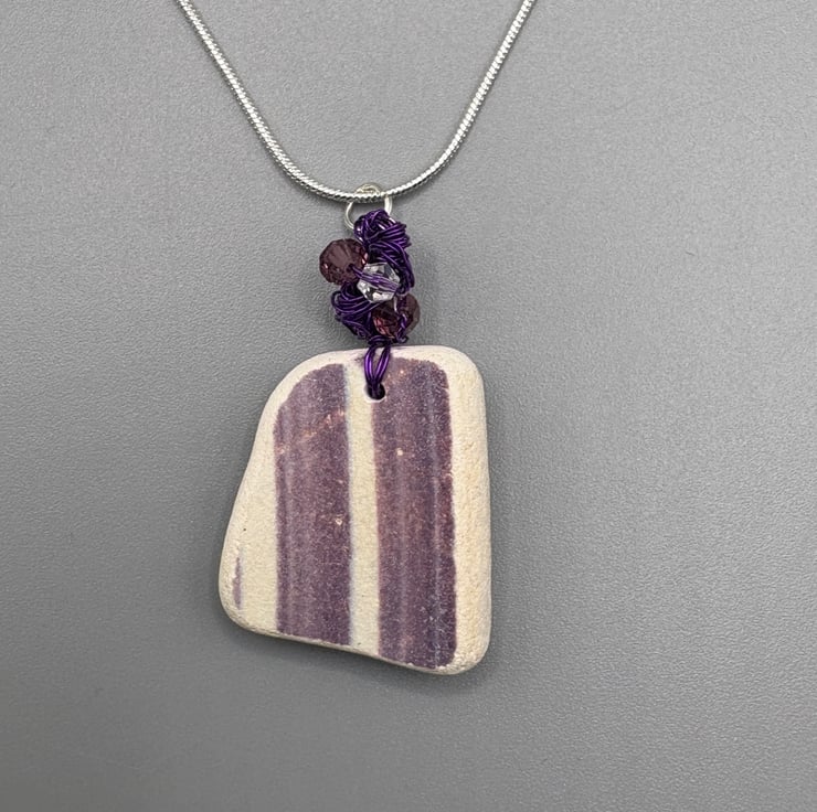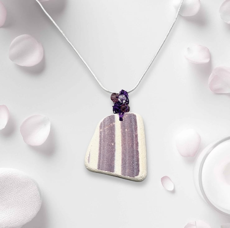 Scottish sea pottery pendant with a purple / mauve design. I have added a purple wire wrap with crystals bail. The pendant will come with a silver plated jump ring & presented on a 18inch Silver plated snake chain. This rare pottery necklace will delight anyone or just treat yourself!... you are worth it!