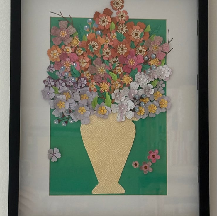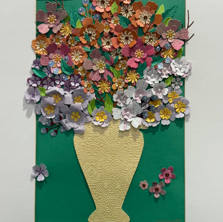 I love fresh flowers and wanted to produce a piece of art that explored the colour and textures of stemmed flowers and foliage. I experimented with various colours, papers and embellishments until I had a picture that could brighten any room in a home.