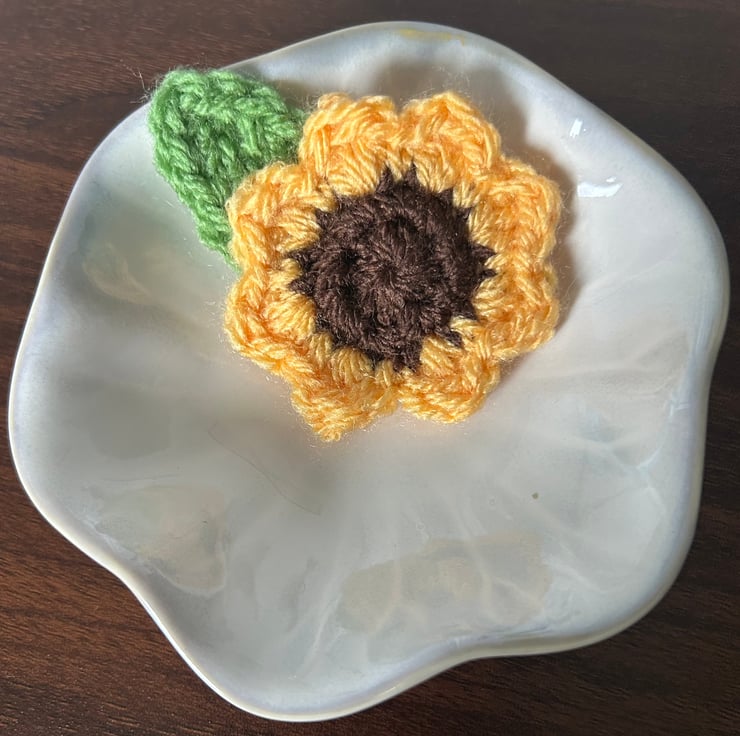 Sunflower brooch, crocheted using acrylic yarn, finished off with a silver tone safety brooch pin.