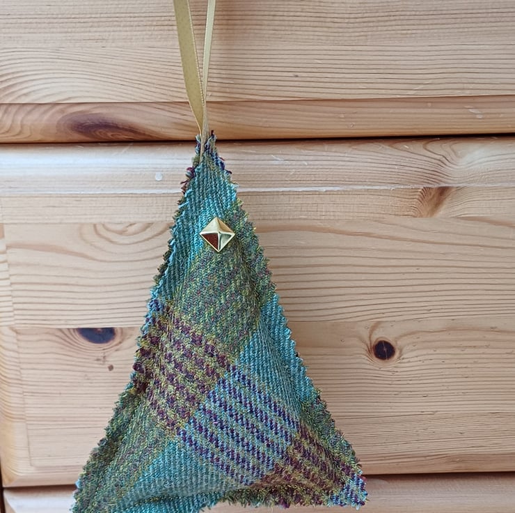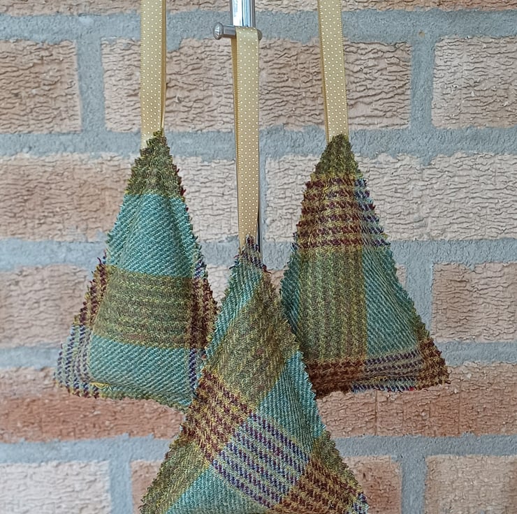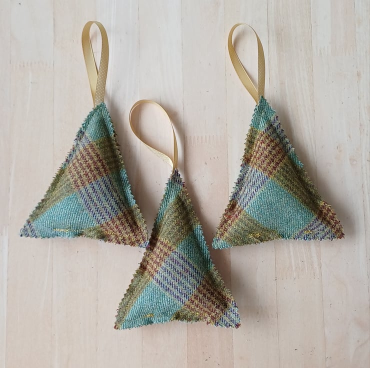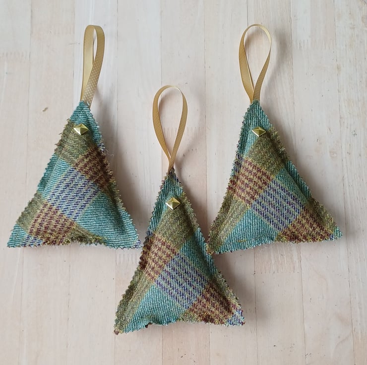 This is a set of 3 Christmas decorations, you can hang them on the tree, or you can use them as door knob hangers, curtain pole hangers or even window decorations. This set comprises of 3 trees, all are made from my wool tweed remnants from my bag making, I have used metallic sewing thread through out, and they features a gold metal stud on one side and are finished off with gold ribbon to hang