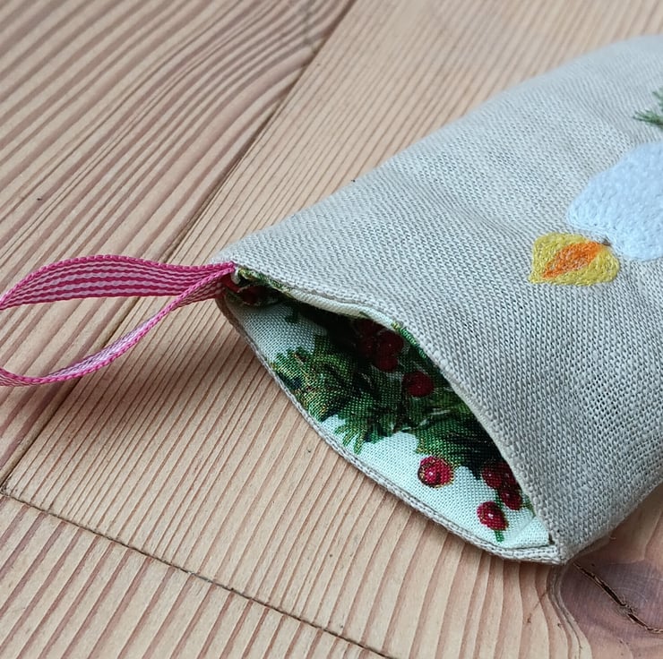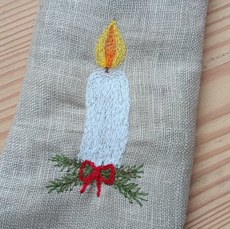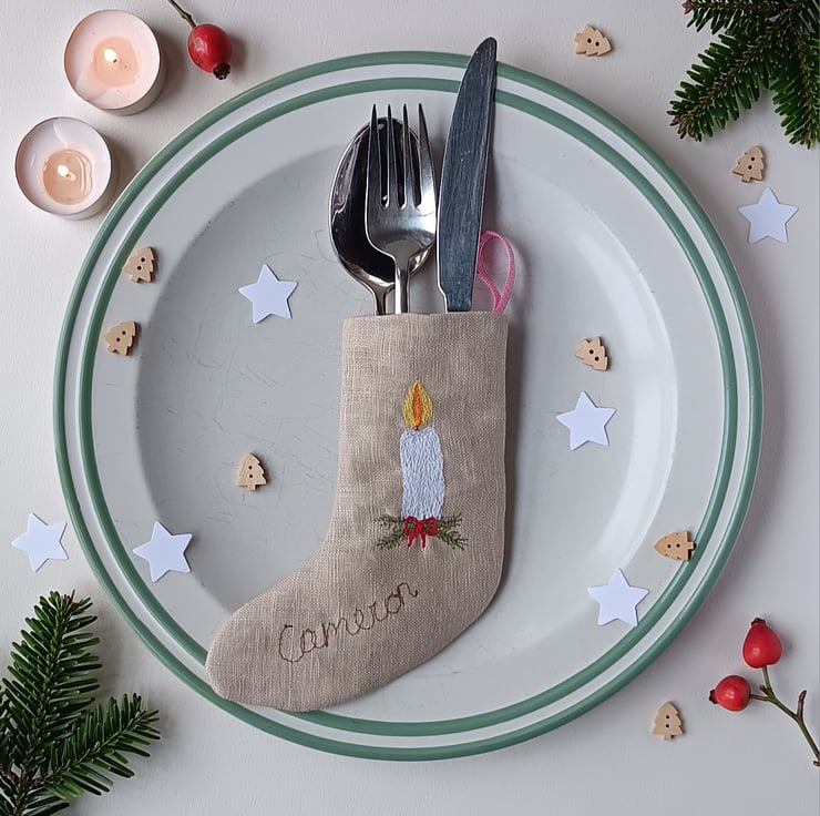 A totally unique and personalised place setting for your Christmas table. Designed as a cutlery holder and personalised place setting, this little stocking can also be filled with chocolate coins or other goodies and hung on the tree. It is made from beige linen and has a candle design stitched in free motion embroidery. Pine greenery and a little stitched red bow are added for festive cheer, along with the name of your choice. It is lined with a holly print fabric and has a red gingham ribbon to hang it by. The stocking measures approximately 7cm wide and 15cm long. Please specify your personalisation at checkout.
