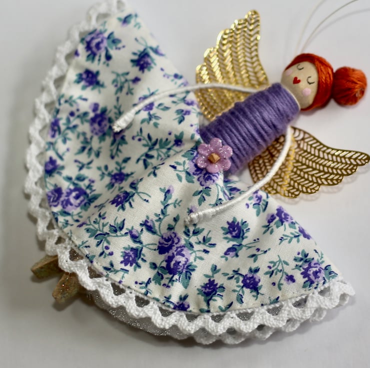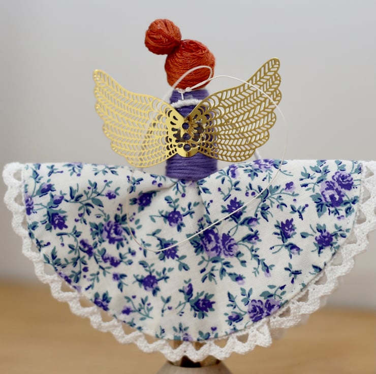 Bespoke handmade, hand stitched, hand painted, hand crafted wooden peg doll, with purple floral pattern dress, purple wool wrapped around bodice and Auburn hair (thread).