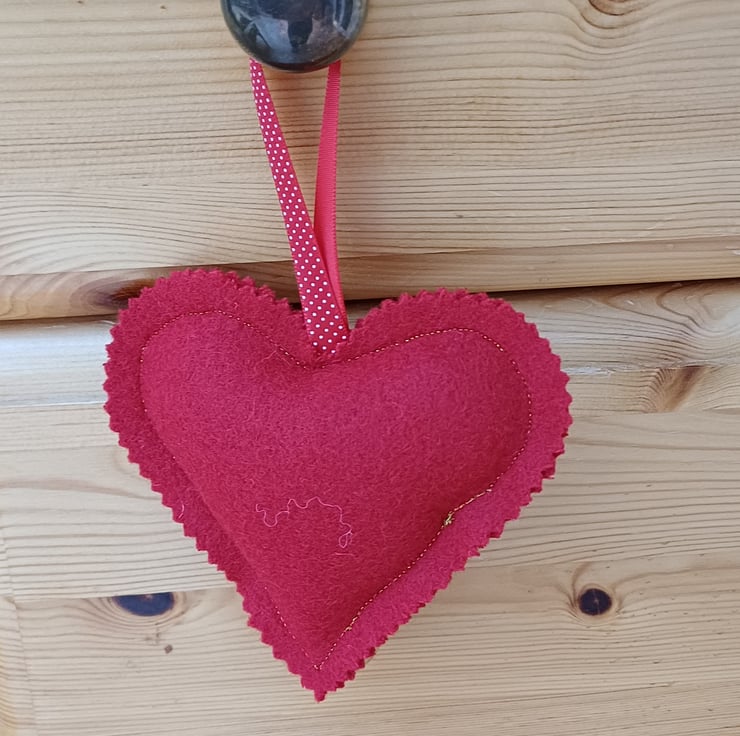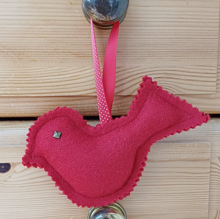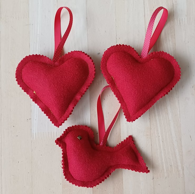This is a set of 3 Christmas decorations, you can hang them on the tree, or you can use them as door knob hangers, curtain pole hangers or even window decorations. This set comprises of 2 hearts and 1 bird / robin. All are made from my wool tweed remnants from my bag making, the birds have metal studs for eyes and all have a ribbon hanging loop