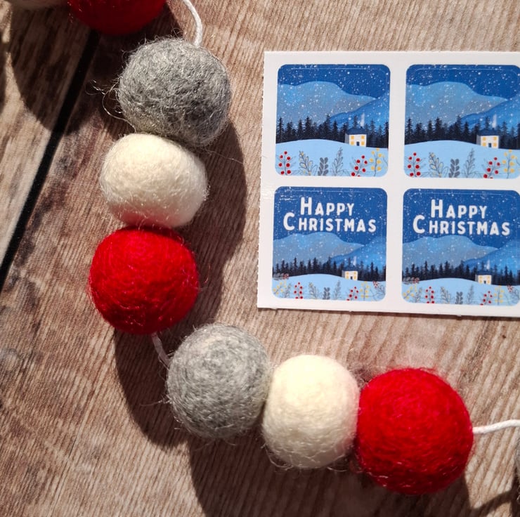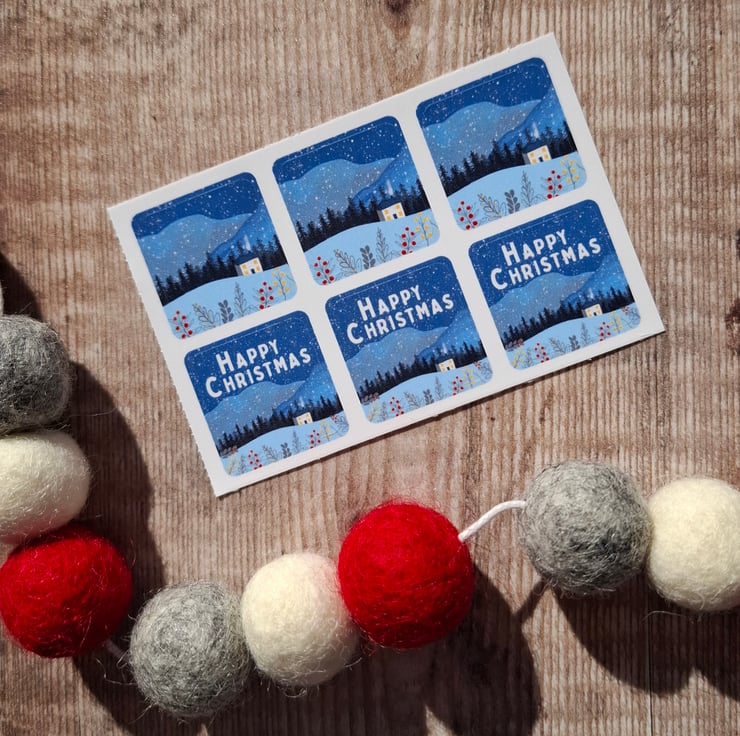 6 stickers, 3 with a snowy cottage among the hills and then 3 with an additional Merry Christmas Message.