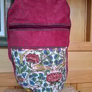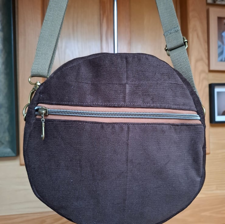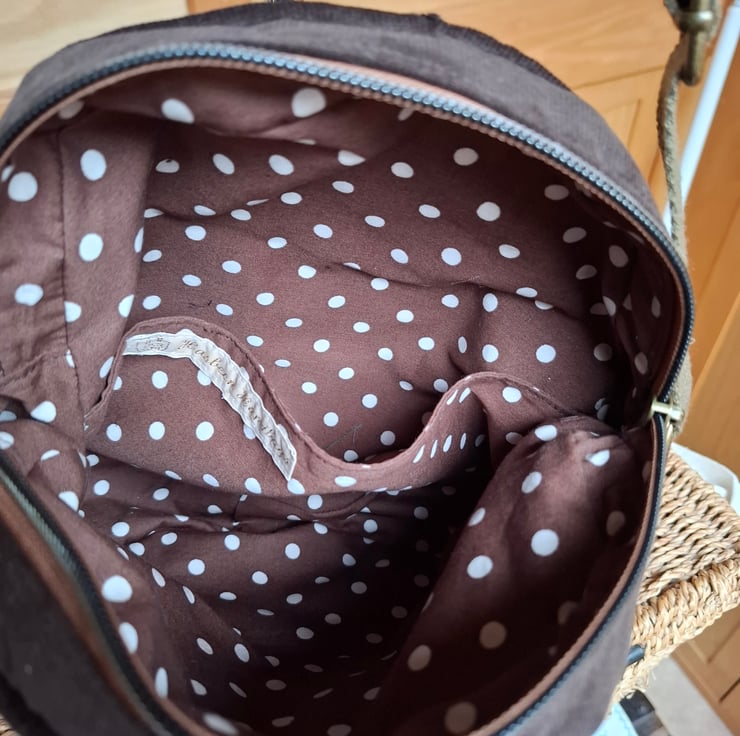 Smart crossbody canteen bag in brown needlecord with zipped outer pocket and orange cotton print patch pocket. Zipped main compartment lined in polka dot cotton print, with inside pocket and adjustable cotton webbing strap.