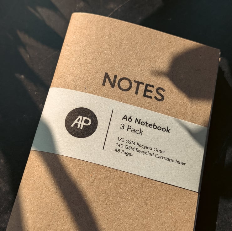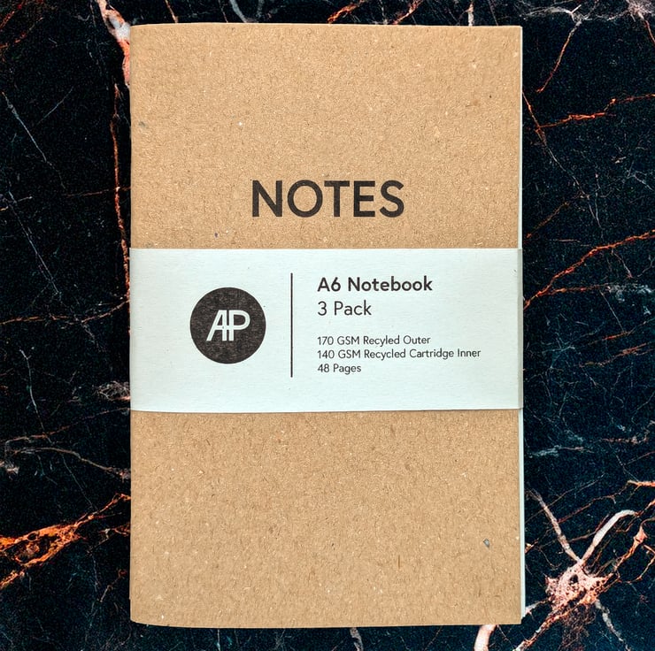 Three Pack of 48 Page A6 Pocket Notebooks which are designed for those who appreciate sustainability without compromising on quality. Made from 100% recycled cartridge paper, this notebook features a durable recycled kraft cover and double staple binding .
