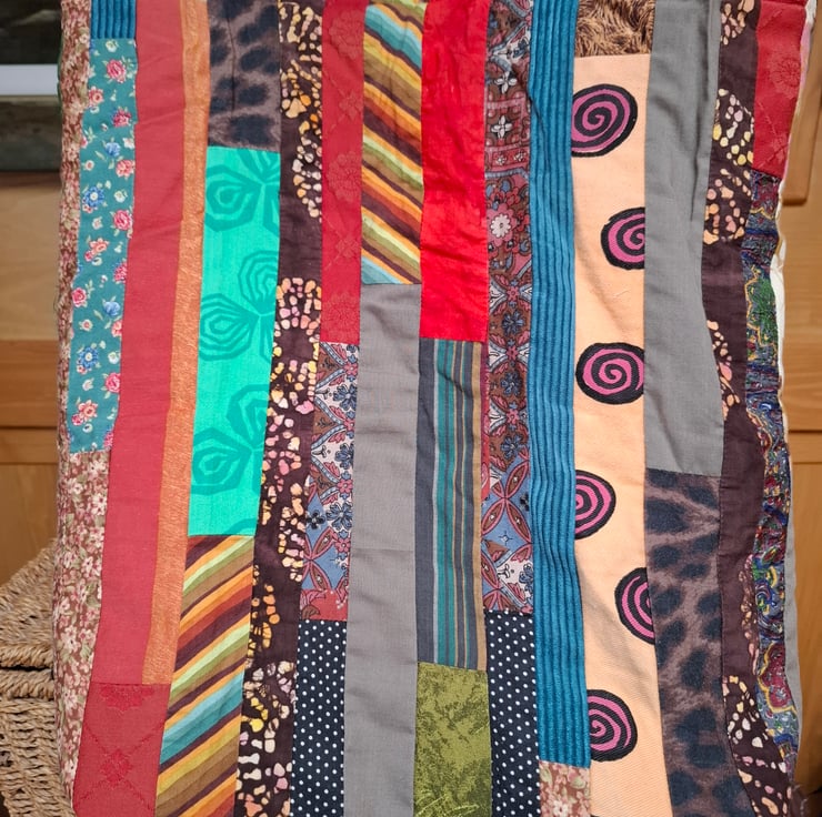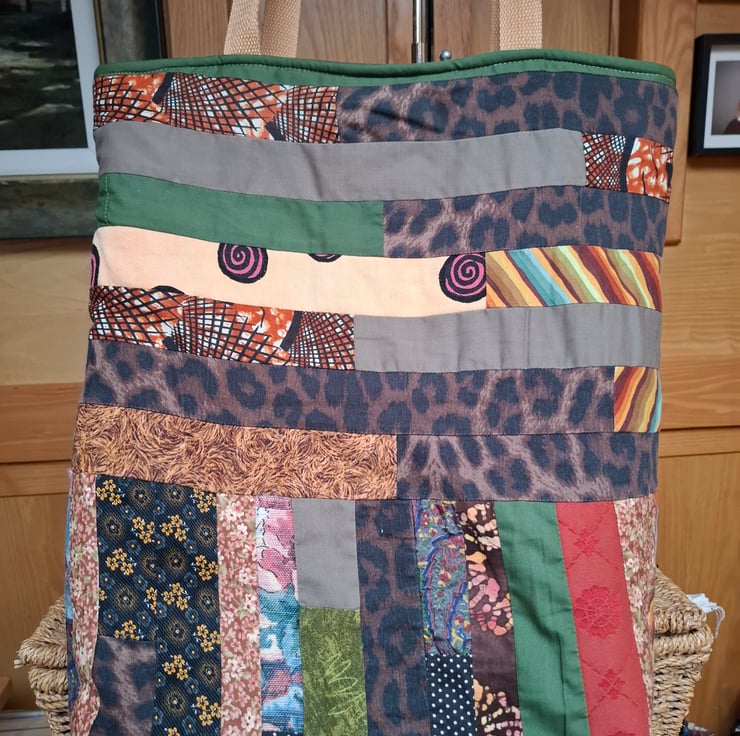Multicoloured, extra deep and reversible padded patchwork tote, with zipped pocket. Lined in Japanese print fabric, which would be just as happy on the outside! Cotton webbing straps, long enough to be worn on the shoulder if required. Ideal as a shopper/laptop/work/school bag.