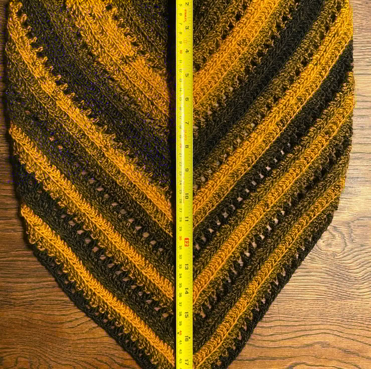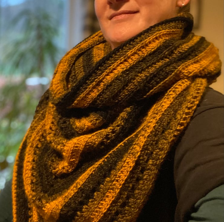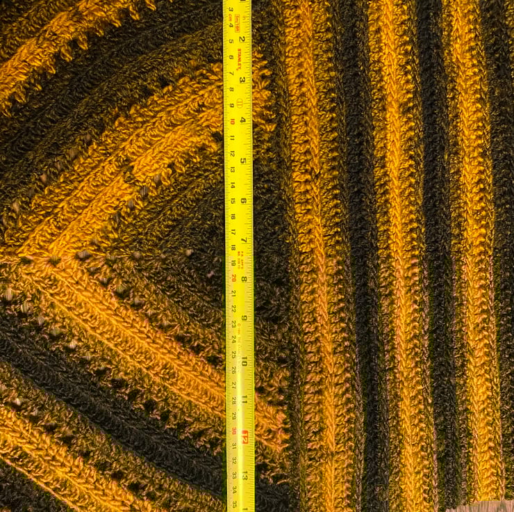 This Jarbo variegated colour yarn in shades of mustard yellow and black has a great autumnal feel. The varied textures and stitches featured in this design really draw the eye and catch attention.