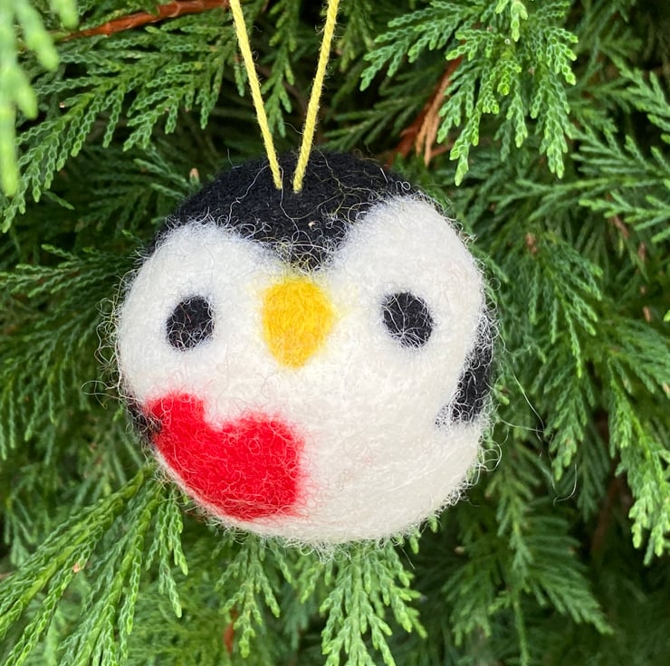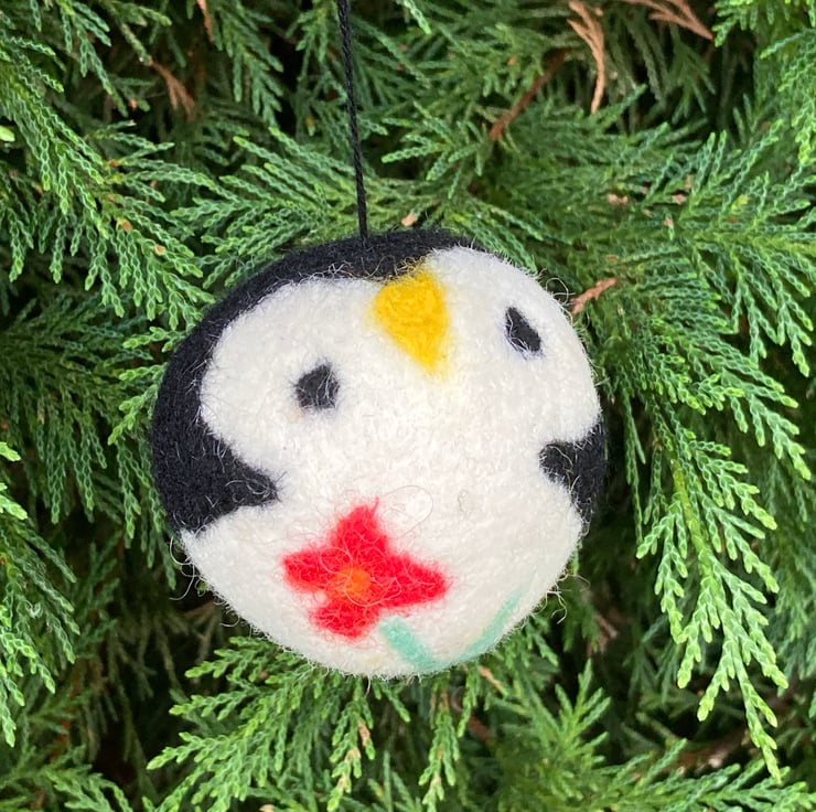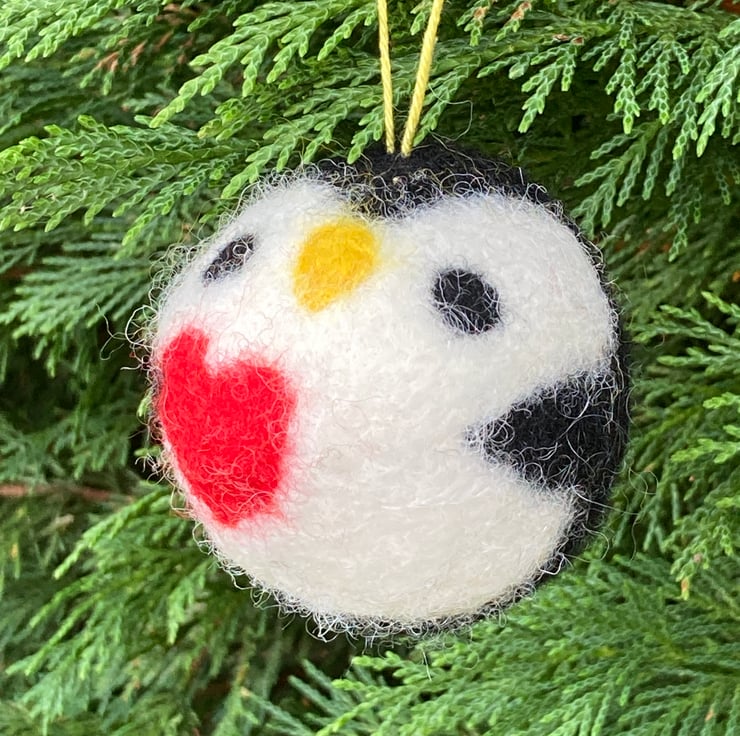 They cute penguins are made from a wool base ball, decorated with scraps of wool yarn and dyed fleece. The colours are needle-felted onto the wool ball and then the balls are washed in the machine to wet felt them. This makes a secure, firm ball that will last. To make these baubles we use the same method as we use for our wool tumble dryer balls. If you decide to hang the bauble on your Christmas tree, when the festive season is over you can use it in your tumble dryer to speed up the drying process and so save money on your energy bills.