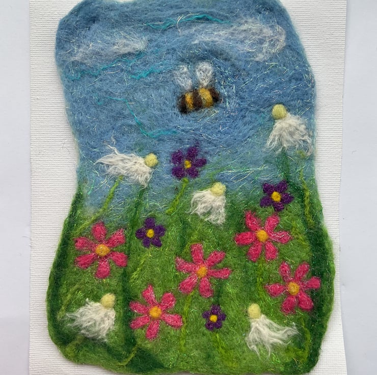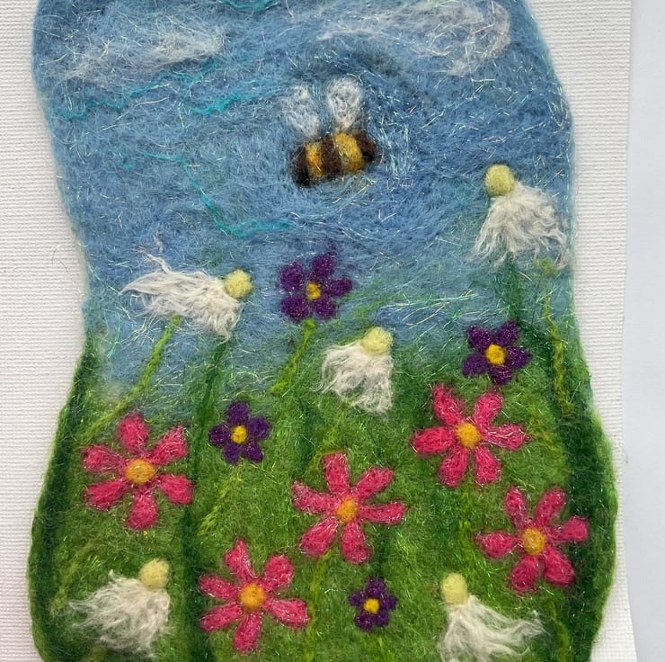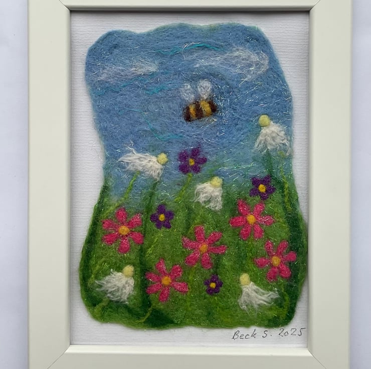 A little bumble bee dances around a wild flower meadow. This picture base is is wet felted, the bee and flowers are needle felted by hand. Materials used are merino wool tops, wool nepps, silk and angelica fibres. The frame size is 13cmx18cm.