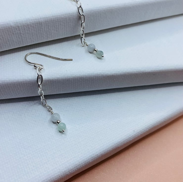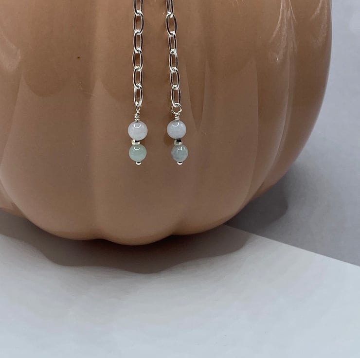These handcrafted jadeite drop earrings each feature two 4mm Type A green Burmese jadeite beads, securely wire-wrapped and suspended from a modern 925 sterling silver paperclip chain and finished with classic sterling silver French hook ear wires for comfortable, all-day wear.