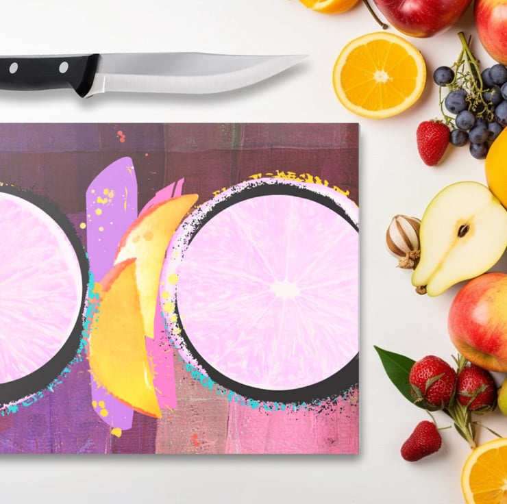 Add a splash of citrus-inspired artistry to your kitchen with our Abstract Pink Grapefruit & Fruits Glass Chopping Board. This vibrant design captures the juicy freshness of grapefruit and tropical fruits in a modern, painterly style — blending bold pinks, oranges, and yellows for a truly eye-catching centrepiece. Perfect for food prep, serving, or display, this tempered glass board is both practical and decorative. Its durable surface resists stains and heat, while the anti-slip feet ensure stability during use. Ideal for brightening up any kitchen or gifting to lovers of unique, contemporary design.