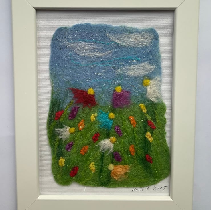 This is a unique handmade art piece. The base is wet felted and all fine details are needle felted on. Frame size is 13cm x 18 cm.
