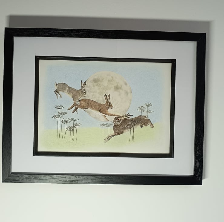 Hares are a common animal on the Isle of Arran, especially at the North End where we live. Early spring sees an increase in behaviour and they frequently are seen playing or displaying. I thought I'd pop them in front of the Moon in this coloured pencil drawing and it seems to work well.
