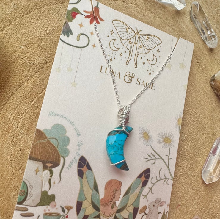 Handmade Turquoise Copper moon, wire wrapped in Sterling Silver, adorned on a 925 Sterling silver 18 inch necklace