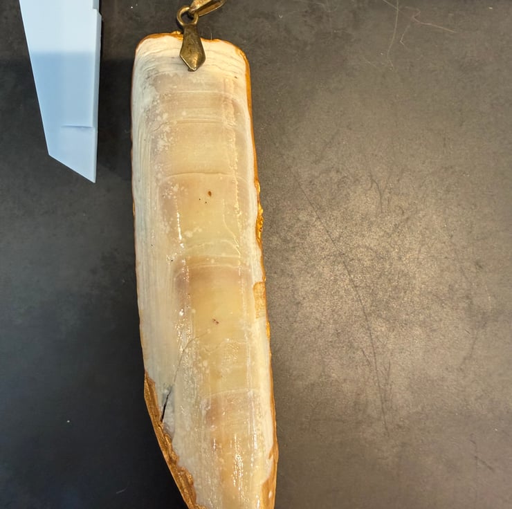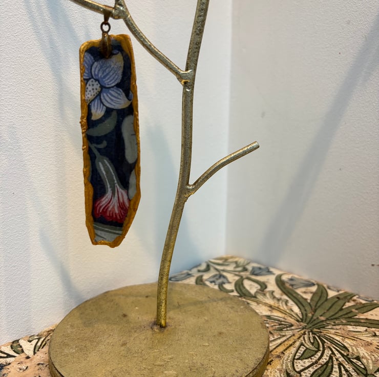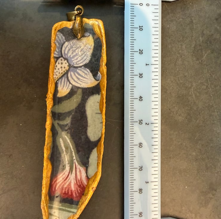 Pretty William morris print decoupaged onto a partial razor clam shell, finished with resin and a stainless steel clasp
