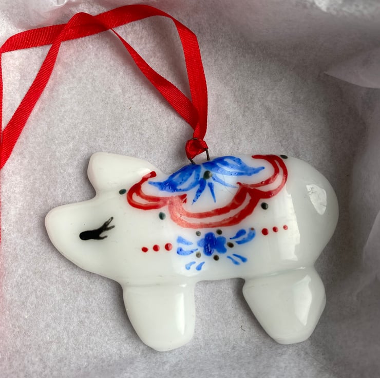 This little piggy is 7 cm across and has been hand painted using glass enamels onto fused glass in the traditional Scandinavian folk art Dala pig style. Hung from small hook with pure silk ribbon - presented in a tissue lined box.