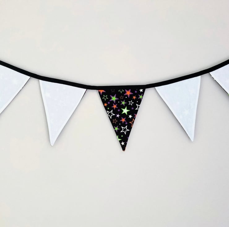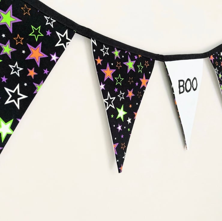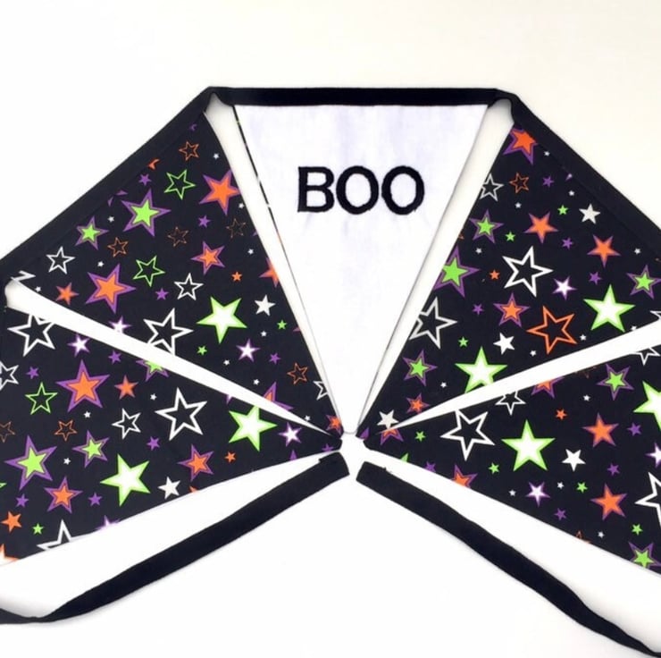 Beautifully handmade bunting. It features 5 cotton flags. 4 glow in the dark stars on a black background and 1 machine embroidered ‘Boo’ flag on a white background sewn onto black cotton tape.