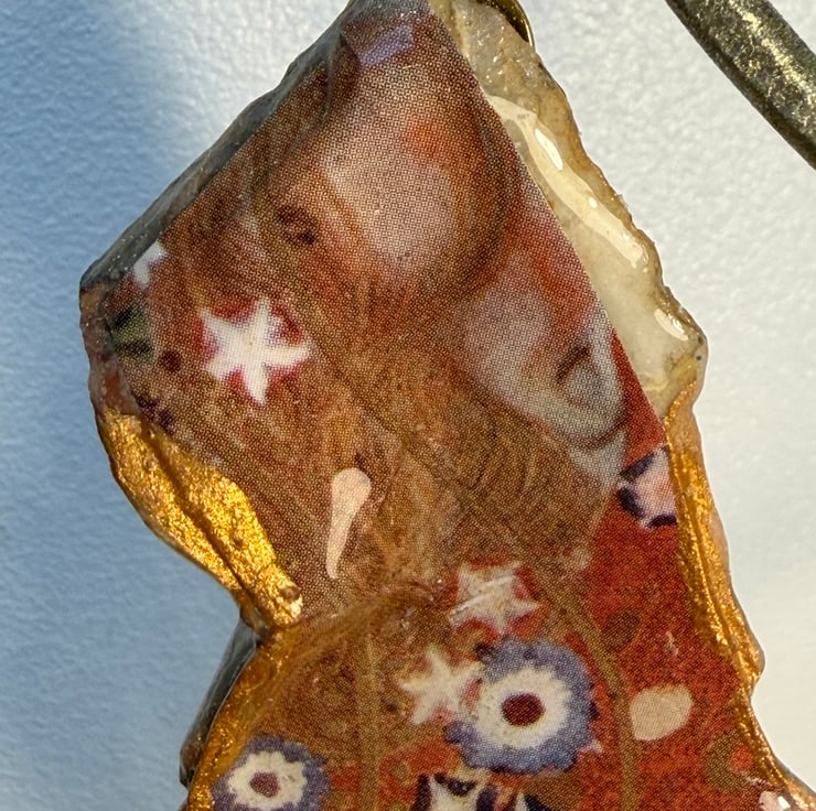 Pretty Klimt image decoupaged onto a partial scallop shell finished with resin and a stainless steel clasp